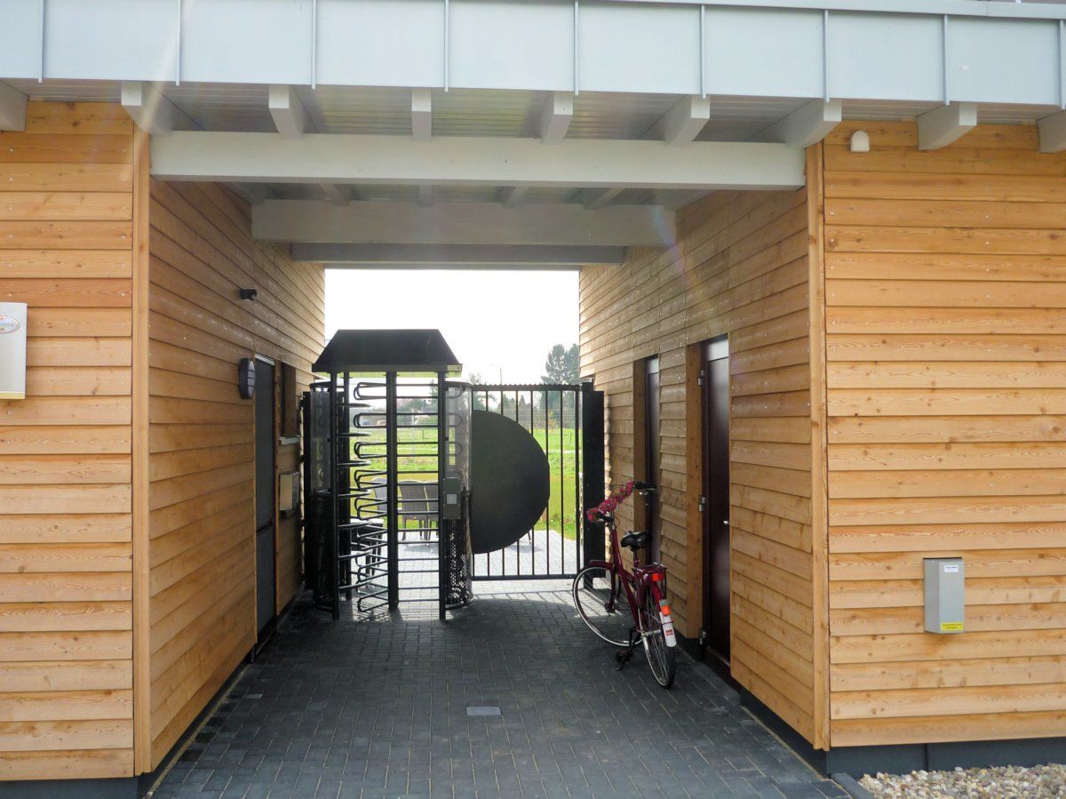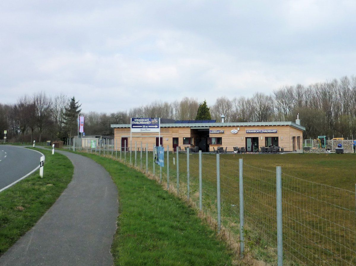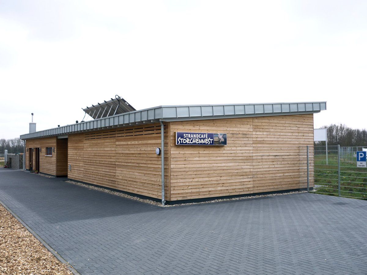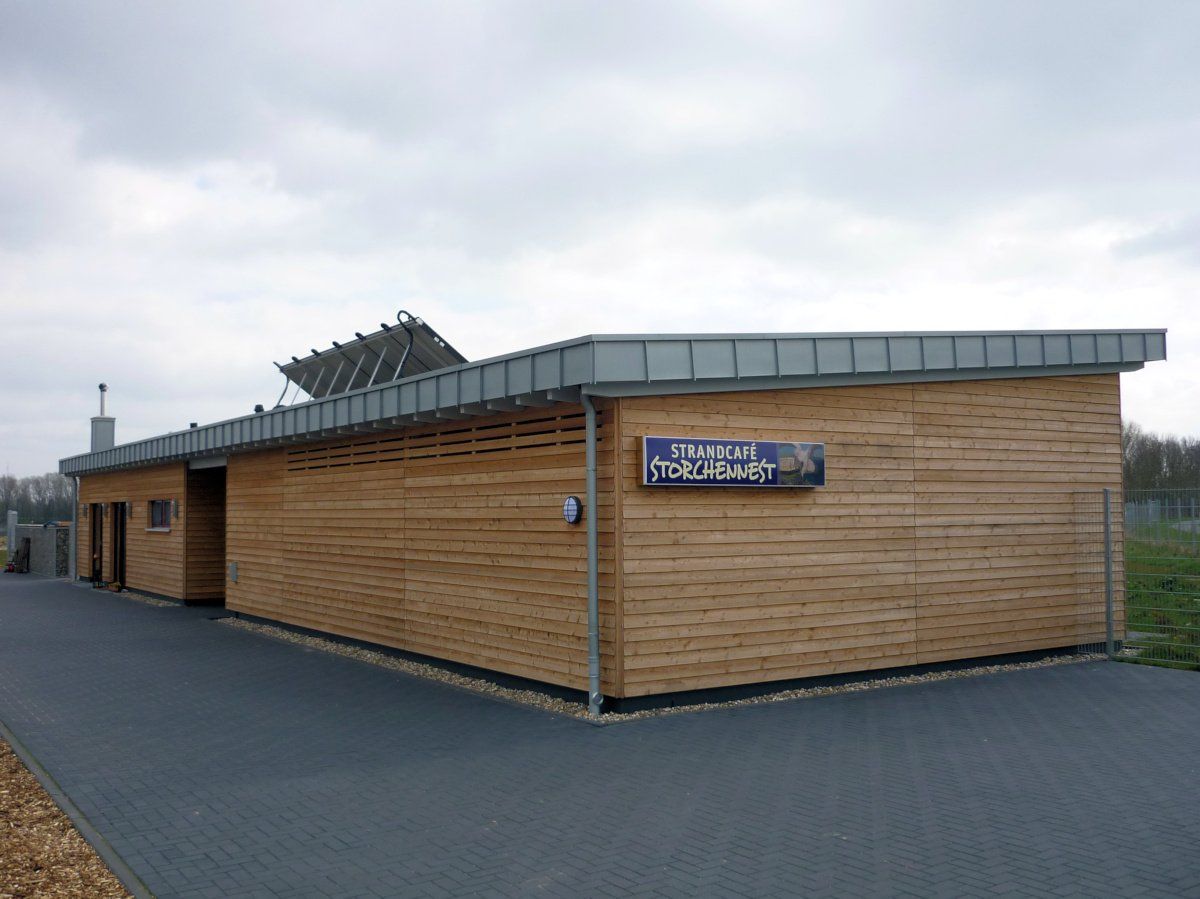 Es beherbergt ein Cafe mit einem Kiosk sowie die Sanitäranlagen am Freizeitzentrum Ellerdonksee in Wesel-Bislich.