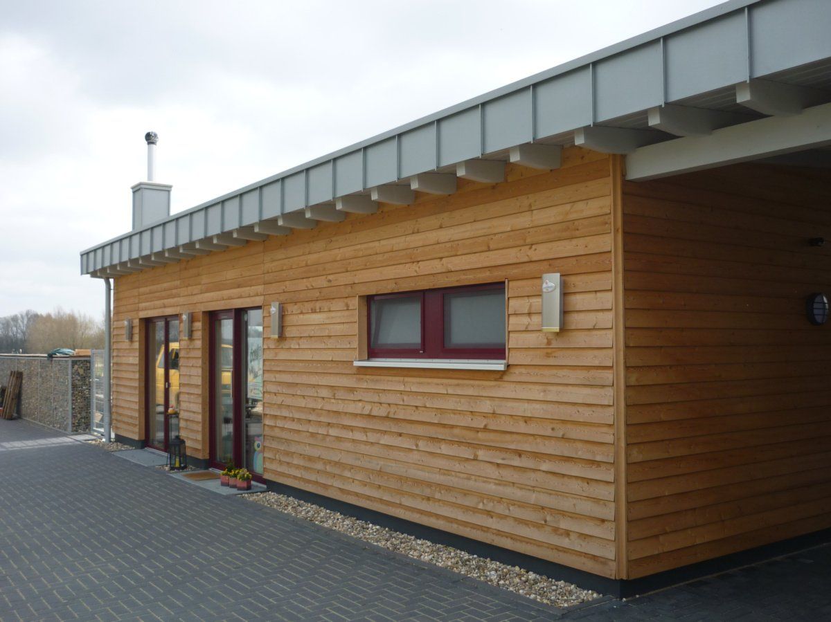 Die Fassaden bestehen aus einer unbehandelten Lärchenholz-Stülpschalung.Das Gebäude wird mit einer Gas-Brennwerttherme beheizt. Der Transmissionswärmeverlust beträgt 0,338 W/(m²K)