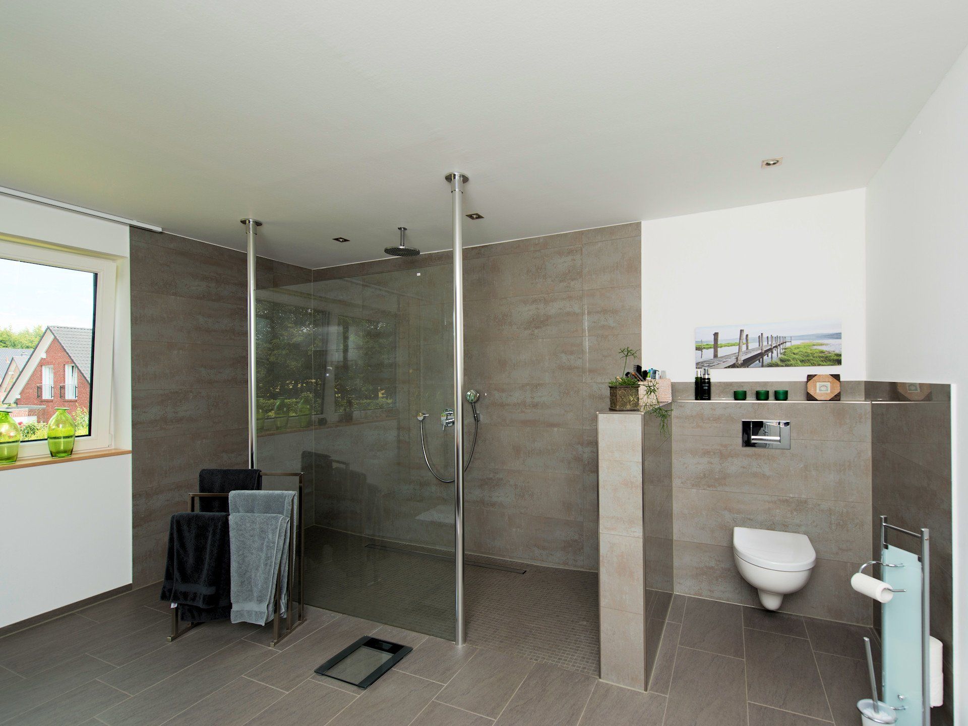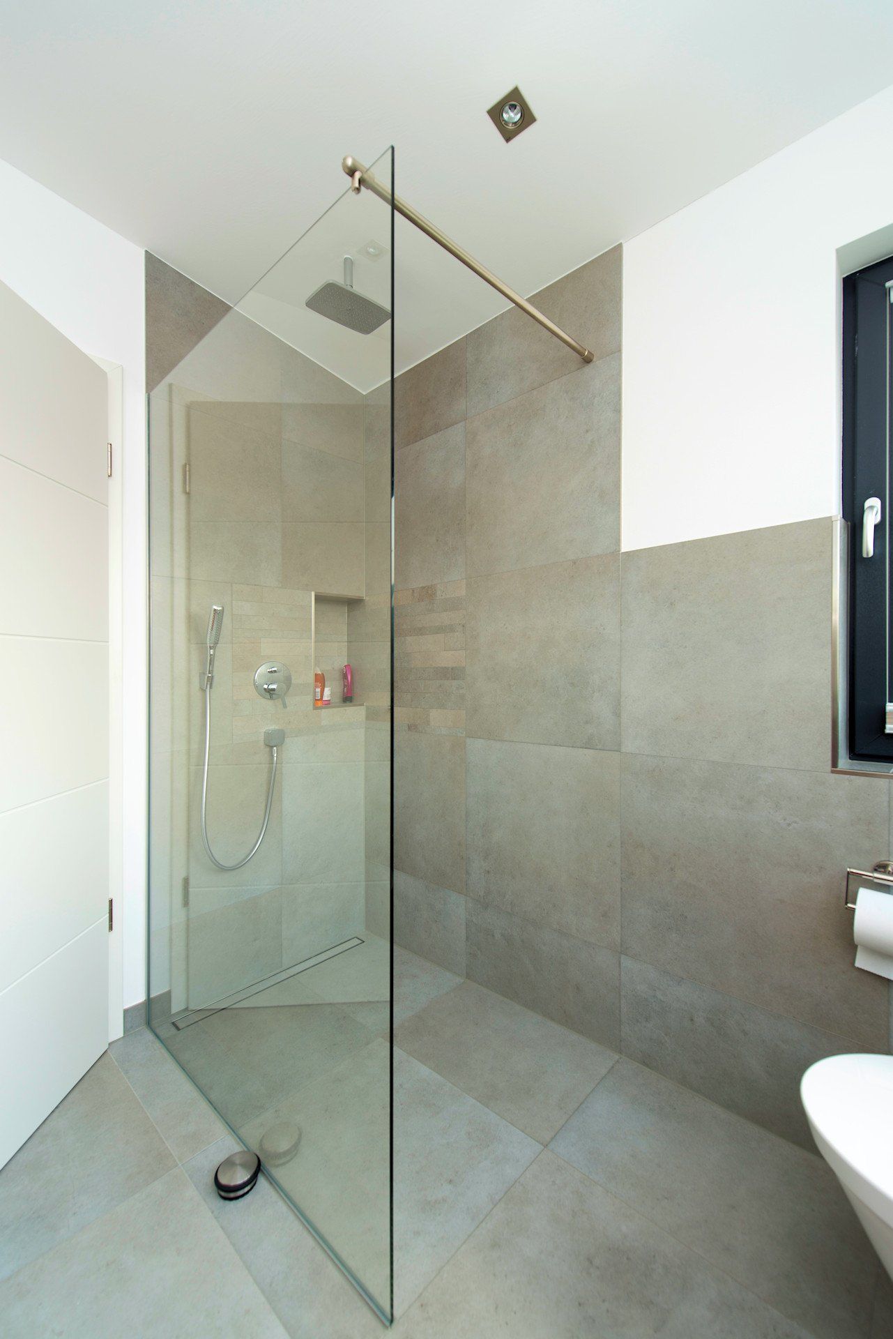 Heute ist es für uns selbstverständlich barrierearm zu planen und zu bauen. Wo immer möglich wird eine bodengleiche Dusche eingebaut. Ebenso vermeiden wir bewegliche Türen im Duschbereich.