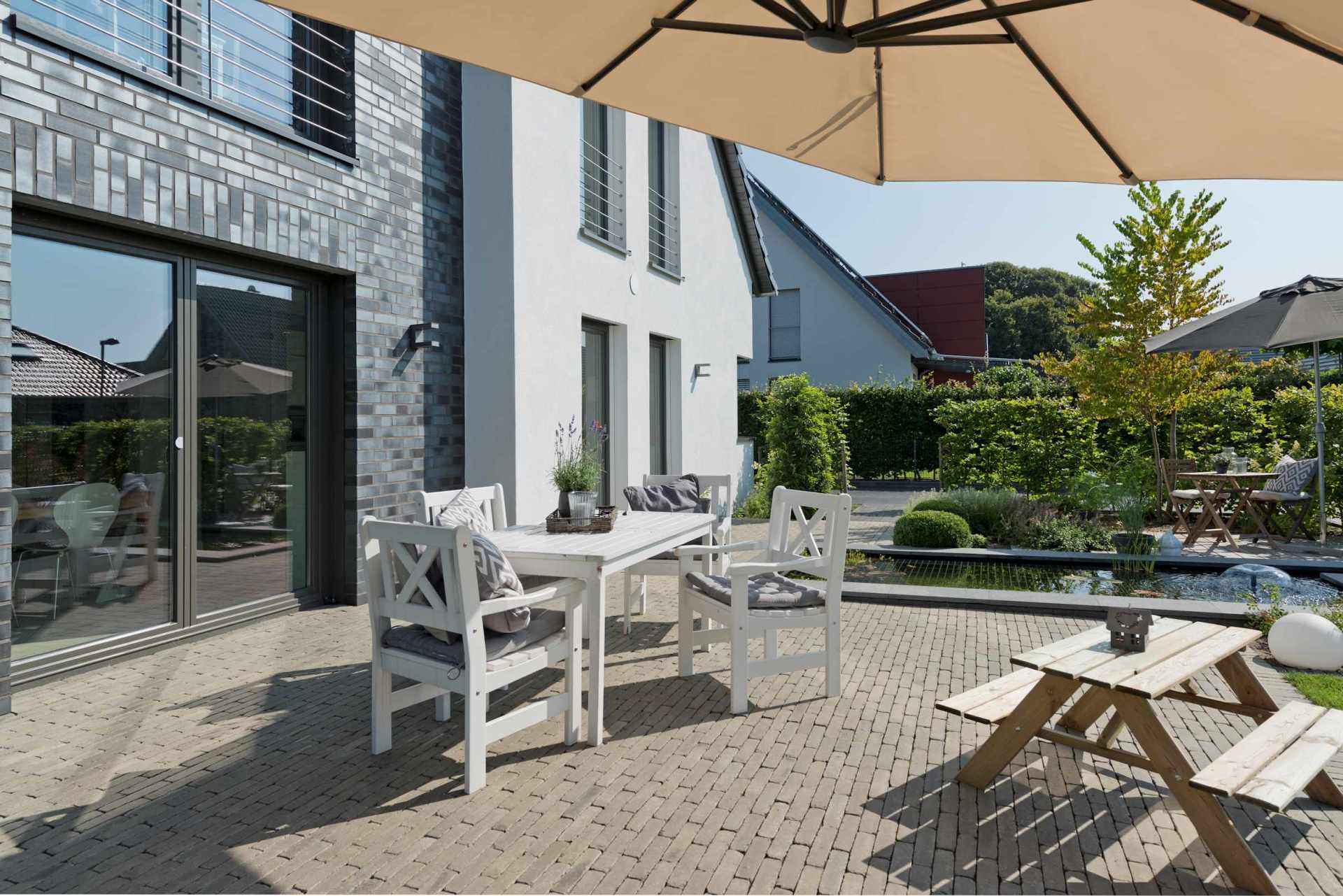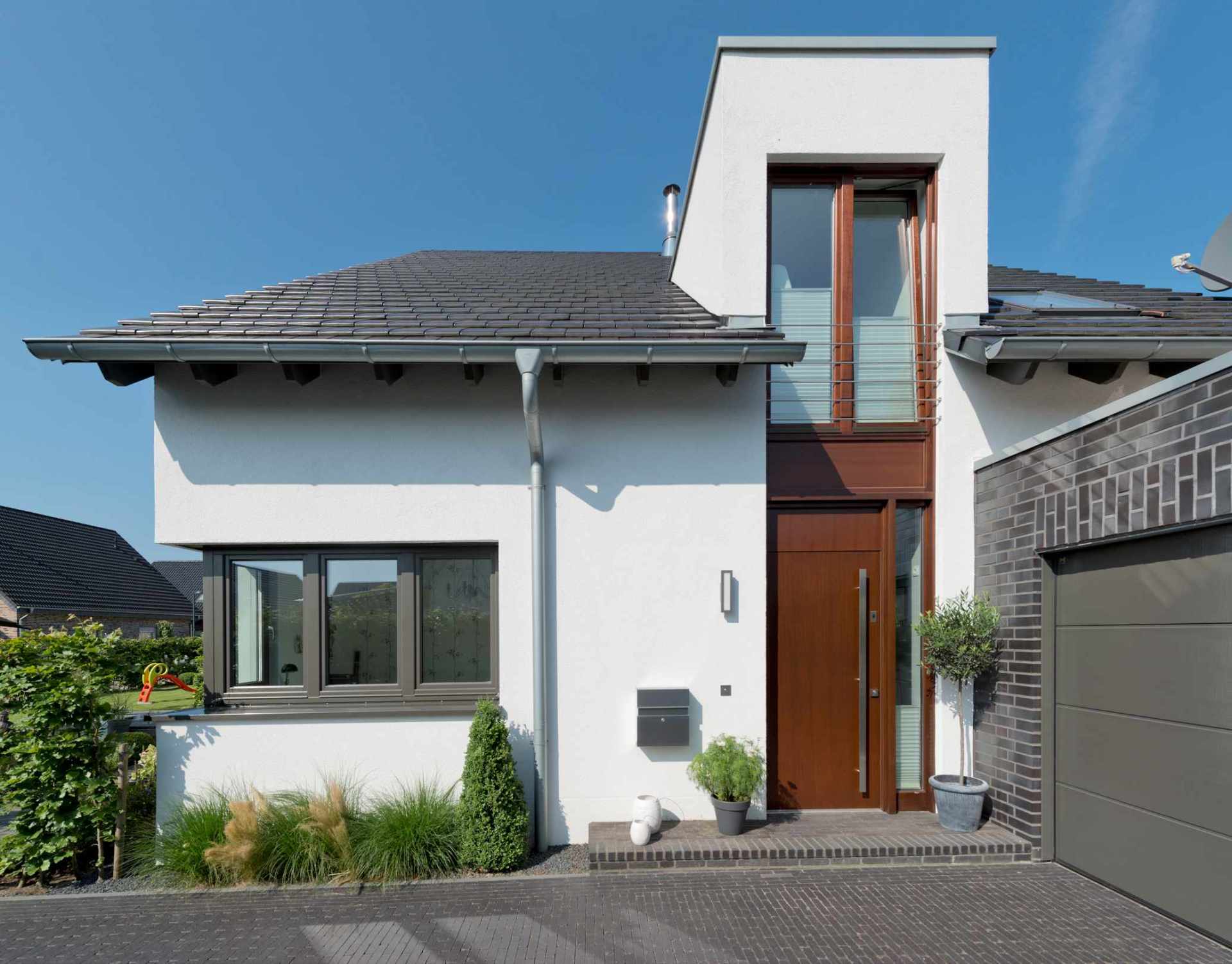 Ein Einfamilien-Wohnhaus mit einer Fassade aus Vormauerklinker und Putz auf einem Holzweichfaser-Wärmedämmverbundsystem.