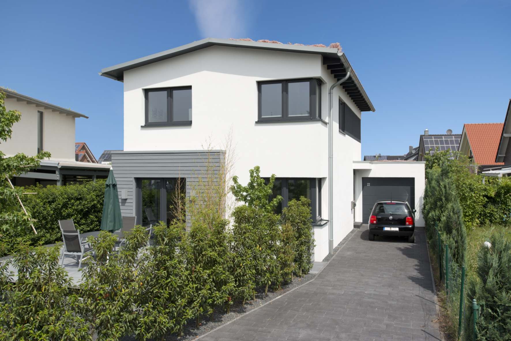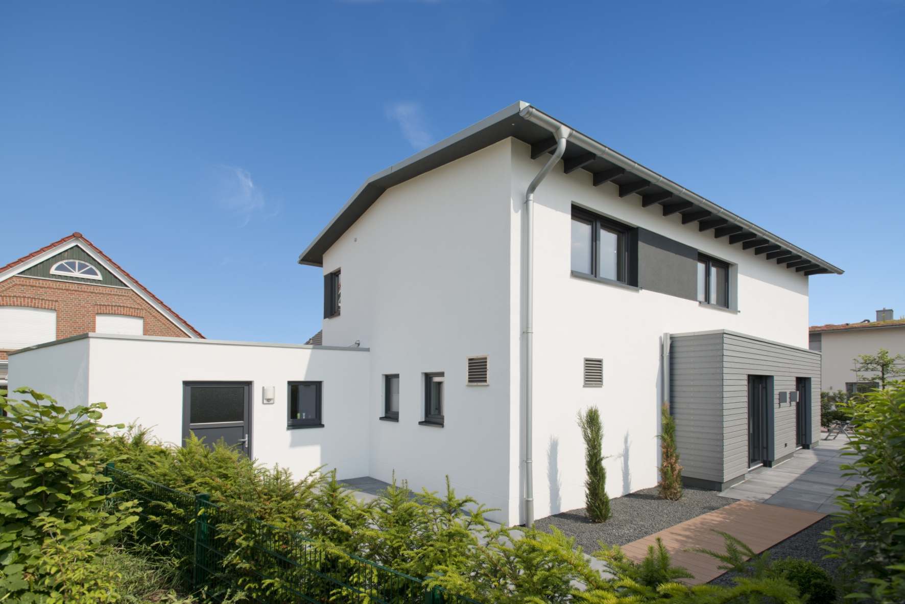 Ein zweigeschossiges Einfamilien-Wohnhaus mit einer Putzfassade auf einem Holzweichfaser-Wärmedämmverbundsystem. In Teilbereichen eine lasierte Lärchenholz-Stülpschalung. Das flachgeneigte Satteldach hat eine Dachbegrünung.